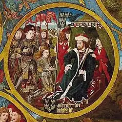 | Фридрих II Воитель | 1211 — 1246 | Герцог Австрии | На переднем плане — битва на Лейте. На заднем плане — Вена. |