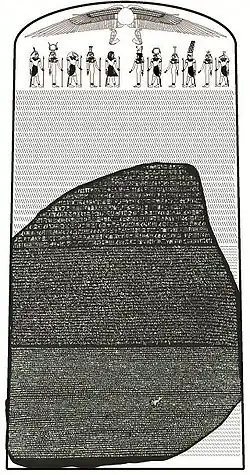 Розе́ттский ка́мень — стела из гранодиорита, найденная в 1799 году в Египте возле небольшого города Розетта (теперь Рашид), недалеко от Александрии, с выбитыми на ней тремя идентичными по смыслу текстами, в том числе двумя на египетском языке — начертанными египетскими иероглифами и египетским демотическим письмом, которое представляет собой сокращённую скоропись эпохи позднего Египта, и одним на древнегреческом языке. Древнегреческий был хорошо известен лингвистам, и сопоставление трёх текстов послужило отправной точкой для расшифровки египетских иероглифов. С 1802 года Розеттский камень хранится в Британском музее (инвентарный номер EA 24).