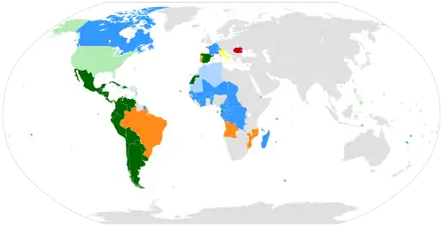 - бывшие колониальные страны (Африка (французский, испанский, португальский языки), небольшие территории в Южной Азии и Океании)[5].