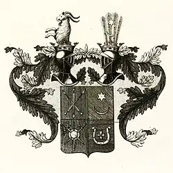 Щит разделен на четыре части, из них в первой части, в красном поле, изображены крестообразно три золотые палицы (? три золотых копья) (польский герб Елита). Во второй части, в зелёном поле, золотая шестиугольная звезда и под нею золотая луна, рогами вверх обращенная (польский герб Лелива). В третьей части, в красном поле, три золотых меча, крестообразно проходящие сквозь золотой же щит. В четвёртой части, в голубом поле, золотой Крест и под ним золотая подкова, шипами обращенная вверх (польский герб Ястржембец).