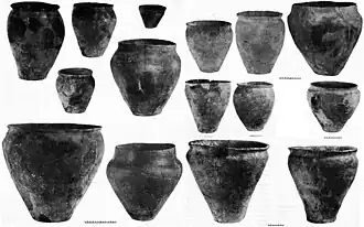 Во второй половине IX века появились лепные и подправленные на круге горшки «древнерусского» типа, отличные от «волынцоидных». Широкое распространение раннекруговых горшков отмечается лишь со второй половины X века. Они орнаментировались врезными линиями (прямыми, волнистыми и зигзагами). Технология была неразвита, обжиг оставался печным[125][126]. В комплексах первой четверти X века доля раннекруговой посуды составляет 2—5 %, первой четверти XI — от 40 до 55 %[127]. Вместе с тем в X веке появилась импортная древнерусская посуда. До окраин роменского ареала она доходила слабо. Так, в земле вятичей раннегончарная керамика местного производства доминировала вплоть до начала XII века[116]. На востоке Посемья, в бассейнах Упы и Северского Донца древнерусская посуда X—XI веков почти не встречается[37]. Наличие среди боршевских материалов салтово-маяцкой кухонной посуды свидетельствует об инфильтрации в славянскую среду некоторого числа алано-болгар. При этом в Подонье попадается керамика, носящая черты как славянской, так и салтовской гончарных традиций[128][129]. На двух поселениях встречены мордовские горшки, вылепленные из глины с добавлением мелкого шамота[130].