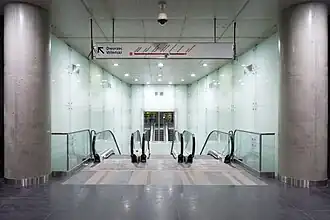 Наземный уровень представлен 7 выходами со стилизованными красными навесами, которые напоминают букву «М». Уровень -1 представлен подземными переходами и вестибюлями станции: выходы 1-3 ведут к восточному вестибюлю, а выходы 4-7 — к западному. Сама станция расположена на уровне -2, её длина составляет 133 м, а ширина достигает 22,6 м. По центру располагается прямая островная платформа длиной 120 м и шириной 11 м с колоннами, обрамлёнными круглыми скамьями.
