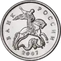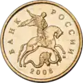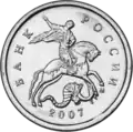 - на аверсе копеечных монет изображён Георгий Победоносец, знак монетного двора, надпись «Банк России» и год выпуска;