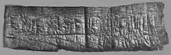 - ↑ Химические анализы оригиналов, проведённые доктором Уолтером Рейсом в Британском музее, показали, что чёрное вещество на самом деле не было асфальтом: чёрная красящая субстанция, взятая с задней и передней части шкур, не похожа на асфальт, а скорее на воск, подобный пчелиному воску, очень нечистого грязного вида. Он оценивает долю золы в количестве 10-15 %. Он легко плавится и, разрушаясь при дальнейшем нагревании, не издаёт запаха асфальта.(Nichols, p. 97)