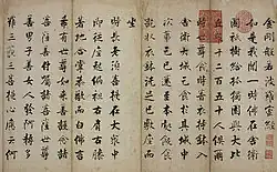 Стандартный лист включал 28 строк по 17 иероглифов в строке. В разные эпохи этот стандарт колебался от 24 до 32 строк. Для рукописей, создаваемых «для себя» или непрофессиональными писцами, эта норма не действовала, скриб вмещал на бумагу столько знаков, сколько мог. Далее писец или корректор проверял написанное и подклеивал следующий лист. Это видно из того, что в свитках нет незаполненных листов. Стандартный китайский свиток достигал длины 8—10 м. Однако в текстах комментариев длина текста могла доходить до 30 м[36]. Если при проверке выяснялось, что писец ошибся, поправки вносились киноварной тушью. Если ошибки были слишком серьёзными, лист переписывали заново, хотя встречались случаи, когда ошибочные листы не удаляли по разным причинам. После окончания работы в колофоне приписывалось имя писца, реже — корректора. Это делалось далеко не всегда. Реже на книгу ставили печать книгохранилища или владельца. Печати иногда ставили на каждой склейке листов так, чтобы половина оттиска приходилась на один лист, и половина — на другой. Это позволяло восстановить порядок листов, если склейка была непрочной. Иногда номер листа писали на линии склейки и в исправном свитке не был виден[37].