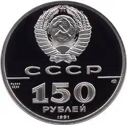 | Аверс: герб СССР, под ним название государства СССР. Внизу по бокам, отделенные от верхней части поля черточками: знак монетного двора (справа) и проба и масса чистого металла (слева). В нижней части поля монеты в две строки указан номинал: «150 // рублей»; под ним — год.