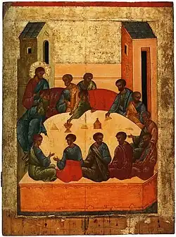 Одной из основных задач иконописцев при изображении Тайной вечери была задача выделения предателя Иуды, которого разоблачает Христос за пасхальным столом. В европейском искусстве Иуду выделяли следующими способами: сажали в стороне от других учеников, лишали нимба, вкладывали в руку мешочек с тридцатью сребрениками и т. д. Древнерусские иконописцы использовали другой приём: у них Иуда через весь стол тянется к стоящему в центре сосуду; здесь они ссылаются на то место Евангелия, где Христос указывает на предателя при помощи блюда: «Он же сказал в ответ: опустивший со Мною руку в блюдо, этот предаст Меня» (Мф. 26:23); «Он же сказал им в ответ: один из двенадцати, обмакивающий со Мною в блюдо» (Мк. 14:20)[31].