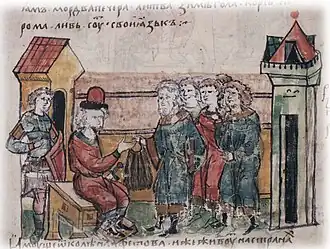 Княгиня Ольга ввела первое административно-территориальное деление на Руси (систему погостов), провела налоговую реформу (установила систему уроков), начала каменное строительство на Руси, в частном порядке приняла христианство[123]. Расширение государства на юг привело к столкновению с могущественной Хазарией, центр которой располагался на нижней Волге. Князь Святослав разгромил Хазарский каганат в 965 году[124]. В 968—971 годах Святослав захватил Болгарию и вёл войну с Византией. После его смерти в 972 году между его сыновьями началась война за престол, победу в которой одержал младший сын Владимир.