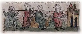 Основание Киева тремя братьями Кием, Щеком и Хоривом и их сестрой Лыбедью. Миниатюра из Радзивилловской летописи, конец XV века