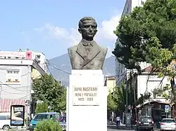 Памятник А. Рустеми установлен в центре албанской столицы Тираны на площади носящей его имя (автор скульптор О Паскали).