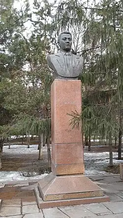 Памятник-бюст Турару Рыскулулы перед зданием Нархоза в Алмате