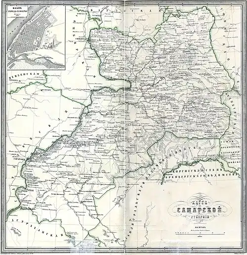 Самарская губерния образована указом Николая I от 6 декабря (18 декабря) 1850 (вступал в действие с 1 января (13 января) 1851). В состав губернии вошли 3 уезда Оренбургской губернии, 2 заволжских уезда Симбирской губернии и 2 заволжских уезда Саратовской губернии.