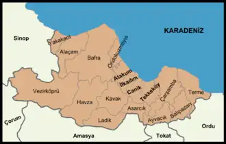 С севера территория ила омывается водами Чёрного моря, устья рек Кызылырмак (Кызыл-Ирмак), Ешильырмак (Ешиль-Ирмак).