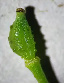 Плоды — слегка асимметричные косояйцевидные стручочки 6—7 × 3—4 мм, покрытые неправильными бородавочками, с косоконическим носиком 0,5—2 мм длиной[7]. При созревании деревянистые, невскрывающиеся, легко отделяющиеся от плодоножки. Плодоножка 1—2 см длиной, косо-прямостоячая. Семена в числе от одного до трёх (односемянных плодов большинство, трёхсемянные плоды единичны), по одному в каждом гнезде, широкоэллиптические до почти шаровидных, с выдающимся зародышевым корешком, 1,5—3 × 1,2—2 мм, жёлто-коричневые, матовые. Семядоли в семенах улиткообразно свёрнуты[5][8]. Масса одного плода — 0,03—0,04 г, масса одного семени — 0,009 г[5].