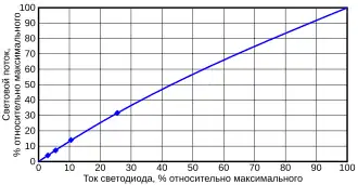 Световой поток светодиода практически прямо пропорционален току светодиода в широком диапазоне изменения тока (см. рисунок).
