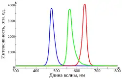 | Белый | Широкий спектральный диапазон | ΔU ≈ 3,5 | Синий (чаще), фиолетовый или ультрафиолетовый светодиод, покрытый люминофором Сборка из трёх светодиодов основных цветов (красный, синий, зелёный) в одном корпусе или на одной плате - RGB-светодиод |