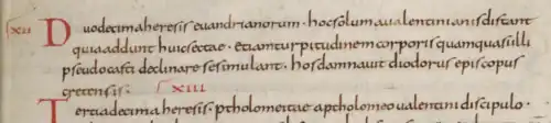 - Аврелий Августин («Ереси, попущением Бога, в одной книге») Augustinus. «De Haeresibus ad Quodvultdeum Liber Unus».