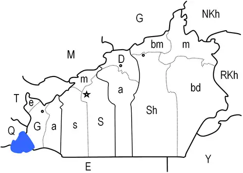 | Соседние районы: E: Исфахан, G: Голестан, M: Мазендеран, NKh: Северный Хорасан, Q: Кум, RKh: Хорасан-Резави, T: Тегеран, Y: Йезд | ||||