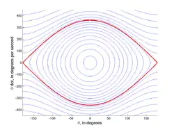 Простым примером фазового пространства с сепаратрисой является математический маятник. Его движение описывается следующим уравнением: