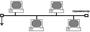 Топология данного типа представляет собой общий кабель (называемый шина или магистраль), к которому подсоединены все рабочие станции. На концах кабеля находятся терминаторы, для предотвращения отражения сигнала.