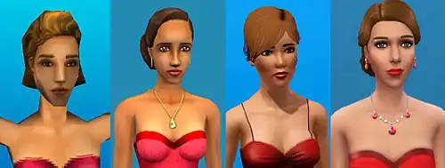 Внешний вид персонажей сильно разнится от каждой части, однако их объединяет одинаковый рост, висящий над управляемым персонажем кристалл — «пламбоб», а также наличие определённых возрастных категорий; в The Sims, симы выглядели, как простые трёхмерные фигурки, передвигающиеся в двухмерном пространстве, взаимодействующие со спрайтами. В режиме создания, симам можно было выбрать внешность с причёской и готовый костюм[35][36]. Чем счастливее управляемый персонаж, тем зеленее будет выглядеть его кристалл над головой[37]. В The Sims 2 появилась возможность более детального изменения внешности персонажа вплоть до изменений черт лица, косметики, цвета кожи и элементов одежды[38]. Вместе с The Sims 3 была добавлена возможность пользоваться цветовой палитрой, задавая желаемый цвет волос, глаз и оттенок кожи, а также более детально выбирать элементы одежды, такие, как например обувь или украшения. Также стало возможным задавать персонажу уровень полноты[38]. В The Sims 4 категоризация одежды была улучшена, появилась возможность более подробно изменять форму тела персонажа, однако была убрана палитра, возвращая ограниченный выбор цвета волос и оттенков кожи, как в The Sims 2[39].