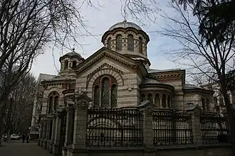 Церковь построена в неовизантийском стиле. В плане имеет греческий крест. Окна разделены на аркады. С восточной стороны храма находится апсида, а с западной — притвор, над которым надстроена колокольня. Главный купол размещён на восьмигранном барабане с арочными окнами[3].
