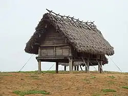История синтоистской архитектуры уходит своими корнями в период Яёй. В то время простые японцы жили в полуземлянках или длинных многоочажных домах. С развитием земледелия для урожая стали строить деревянные хранилища с приподнятым полом — такаюка. Возможно, эти хранилища послужили прообразом главного здания святилища[2][3].