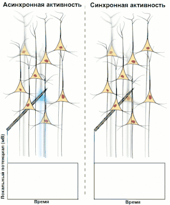 - локальная синхронизация, синхронизация активности отдельной популяции нейронов, которая приводит к образованию макроколебаний и может становиться заметной в сигнале ЭЭГ