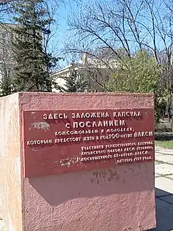| Капсула с посланием «комсомольцам и молодежи, должны жить в 100-ю годовщину ВЛКСМ» от участников торжественного пленума Луганского обкома ЛКСМ Украины, посвящённого 50-летию ВЛКСМ (октябрь 1968) | ![]() | В апреле 2008 года был заложен камень под строительство памятника жертвам ОУН-УПА,[8] который впоследствии установили на площади Героев Великой Отечественной войны. | |