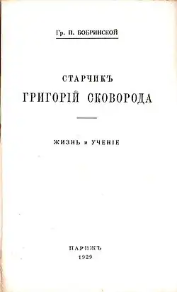 29. Бобринской П. Гр. Старчикъ Григорій Сковорода. Жизнь и ученіе. Парижъ, 1929. С. 14.