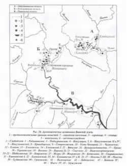 По среднему течению Вятки располагалось 16 древнерусских укреплённых поселений. Самые крупные городища со временем превращались в детинцы городских поселений (Вятка, Котельнич, Никулицын, Слободской, Шестаков)[5].