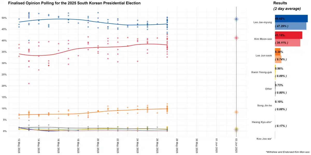 По результатам голосования с 16 по 19 апреля в центральном регионе страны Чхунчхондо, Ли Чжэ Мён одержал убедительную победу, получив поддержку в 88,15 %. За ним следовали губернатор провинции Кёнгидо Ким Дон Ён с 7,54 % и бывший губернатор провинции Кёнсан-Намдо Ким Кён Су с 4,31 %[23]. С 17 по 20 апреля голосование проходило на юго-востоке — в Йоннаме, где Ли Чжэ Мён закрепил своё лидерство, получив 90,81 %. Ким Кён Су получил 5,93 %, а Ким Дон Ён — 3,26 %[24]. С самого начала кампании поддержка Ли по всей стране продолжала расти, когда в опросе Realmeter, проводившемся с 16 по 18 апреля, он возглавил список кандидатов с результатом 50,2 %, впервые превысив отметку в 50 процентов. На втором месте за ним следовал бывший министр труда Ким Мун Су из партии «Сила народа» с 12,2 %[25]. 26 апреля Ли Чжэ Мён одержал убедительную победу в юго-западном регионе Хонам, набрав 88,69 % голосов. Следовавшие за ним Ким Дон Ён и Ким Кён Су набрали 7,41 % и 3,90 % соответственно[26]. 27 апреля Ли Чжэ Мён был официально объявлен кандидатом в президенты от «Демократической партии», получив поддержку 89,77 % избирателей. Ким Дон Ён оказался на втором месте с 6,87 %, а Ким Кён Су набрал 3,36 %. В предвыборной кампании либерал Ли сталкивается с проблемой обращения к центристам и улучшения своего неблагоприятного имиджа среди колеблющихся избирателей. Хотя он сохраняет сильную базу поддержки, ему ещё предстоит добиться значительных успехов среди центристов, которые отвернулись от подвергнутой импичменту администрации Юна. Кроме того, юридические проблемы остаются большой проблемой для него, так как Верховный суд ускорил рассмотрение обвинений в нарушении избирательного законодательства против Ли. Вероятность, что решение будет вынесено до голосования 3 июня, резко выросла[27]. 30 апреля Верховный суд постановил, что апелляционный суд допустил ошибку в толковании, и отправил дело на новое рассмотрение. Критики обвинили судебную систему, попытавшуюся заблокировать участие в выборах самому популярному кандидату, в политизации, в то время как другие утверждали, что суд действовал ответственно, учитывая срочность перед голосованием 3 июня[28].