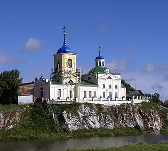 Белокаменный храм Св. Георгия стоит на месте деревянной церкви, которая появилась здесь, скорее всего, одновременно с острогом. Первоначальная церквушка, вероятно, горела не раз. Крупный пожар 1801 года уничтожил её «до основания». Сначала прихожане хотели восстановить деревянную церковь, но епископ Пермский и Екатеринбургский Иустин (Вишневский) постановил: «Деревянной церкви по именному указу строить не позволяется. А о строении каменной, хотя и не высокой и не пространной, должно просить особливо». По причине крайней бедности прихожан, приступить к постройке каменной церкви сразу не смогли. Только в 1805 году слобожане вновь просили епископа о выдаче грамоты на заложение церкви во имя великомученика Георгия Победоносца, с приделом преподобным Зосиме и Савватию, соловецким чудотворцам. Храм был заложен в июне 1806 года. В декабре 1807 года освящён придел. Главный храм был освящён лишь в 1831 году, по благословению епископа Пермского и Екатеринбургского Мелетия[18]. Богослужение в главном храме совершалось в тот период только летом, а в остальное время — в очень тесном приделе. Иконостас в летнем храме был двухъярусный, выкрашен белой краской, а резьба вызолочена[18]. Свой нынешний вид храм приобрёл к 1894 году, когда была завершена колокольня и епархиальное начальство, по просьбе прихожан, разрешило соединить аркой оба храма, а в приделе престол убрать.