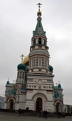 Пятиглавый Успенский собор, выполненный в стиле русского зодчества XVII века, стал настоящей достопримечательностью города. Установленный в центре города (в наши дни восстановлен на прежнем месте), храм был виден со стороны Иртыша и являлся архитектурной доминантой Омска.[2]