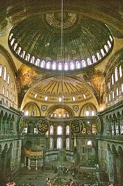Середина широкого нефа, квадратная в основании, ограничена по углам четырьмя массивными столбами, подпирающими громадные арки, и покрыта довольно плоским куполом 31 м в диаметре, вершина которого отстоит на 51 м от пола[77]. Купол состоит из сорока радиальных арок; в нижних частях межарочных промежутков прорезаны арочные окна (их также 40), благодаря чему в нижней части купола создаётся ощущение сплошного светового пояса[78]. Купол связан с перекрываемым прямоугольным в плане пространством с помощью сферических треугольников — парусов, — которые в дальнейшем получили большое распространение в мировой архитектуре[77]. К подкупольному пространству примыкают с востока и запада две колоссальные ниши с полусферическим верхом: в восточную нишу открываются своими арками ещё три меньшие ниши, из которых средняя, служившая алтарной апсидой, глубже остальных и выступает из общего плана храма в виде полукружия; к западной большой нише примыкают также три ниши; из них средняя, представляющая вверху не полусферический, а обыкновенный коробовый свод, содержит в себе три двери, ведущие в пристроенные к храму внутренний и внешний притворы, впереди которых некогда находился теперь несуществующий двор, обнесённый галереей с колоннами.