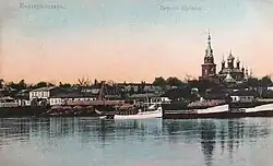 7 июня 1910 года во второй день Троицы — праздник Святого Духа — Свято-Троицкий собор торжественно освятили. Кирпичная трёхпрестольная церковь в русском стиле, построена на пожертвования прихожан. Двухэтажное здание храма было увенчано 11 куполами, к главному объёму храма с запада примыкает трапезная, соединяющая его с четырёхъярусной колокольней. В нижнем этаже были Серафимовский и Евфросиньевский приделы[4]. Во дворе храма действовала церковно-приходская школа и городское начальное училище.