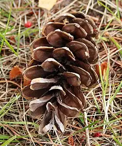 Шишки одиночные или двойные, цилиндрические, с жёсткими чешуями, 8—10 см длиной и до 4 см толщиной, созревают на третий год. Семена длиной 5—7 мм, длина крыла до 15 мм[4][5].