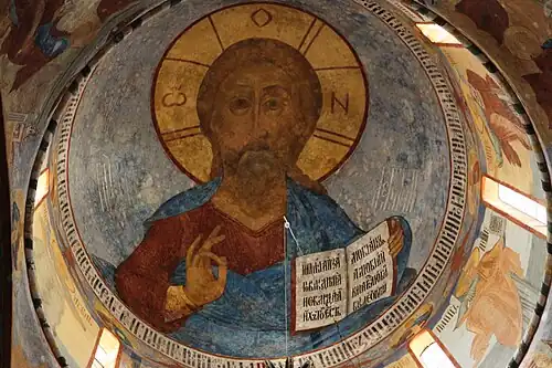 Иконографическая схема основного куба следовала образцу Успенского собора Московского кремля и Успенского собора Троице-Сергиевой лавры. В центральном куполе представлены Христос Вседержитель, в боковых куполах — Иоанн Предтеча, Богоматерь Знамение, Отечество и Спас Эммануил. На стенах барабанов изображены праотцы, на подпружных арках — апостолы. На сводах написаны праздники — Рождество Христово, Сретение, Богоявление, Вознесение, Воскресение, Успение богоматери, Благовещение, Рождество Богоматери и Преображение.