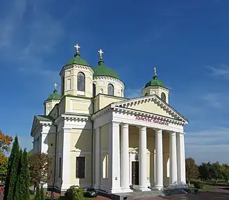 Каменный, квадратный в плане собор, с 4-колонным портиком в антах (боковые стены) тосканского ордена главного (юго-восточного) фасада, который завершает треугольный фронтон. С северо-востока примыкает с основному объёму апсида в виде полуротонды. Торцевой (юго-западный) фасад украшен портиком плоским из 4 полуколонн, завершающийся треугольным фронтоном. Венчает собор полусферический купол посредине и четыре меньшего размера восьмигранные купола по углам.