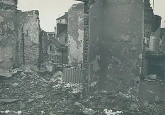 - Русский памятник бомбардирован, бомба упала точно в основания памятника, взрыв которой выкопал 2 метровую яму, верхняя часть обелиска отламывается и перемещается к нижней части, которая сильно наклоняется, но памятник уцелел и через некоторое время отремонтирован.[62]