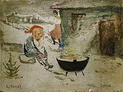 | Ниссе и рождественская каша англ. Goblin with Christmas Porridge, норв. Nisse med julegrøt | ![]() | 1881 | деревянная панель, масло | 15,5 x 21 | 42 | коллекция Петера Андреаса Лунна | |