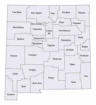 | Берналийо | Bernalillo | 35001 | 1852 | один из первоначальных округов | 3020 | 662 564 | Альбукерке | Albuquerque |