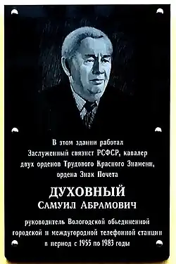 - ↑ «Ростелеком» в Вологде установил мемориальную доску заслуженному связисту Самуилу Духовному. Официальный корпоративный информационный сайт ПАО «Ростелеком» (27 июня 2016). Дата обращения: 11 августа 2018. Архивировано 11 августа 2018 года.