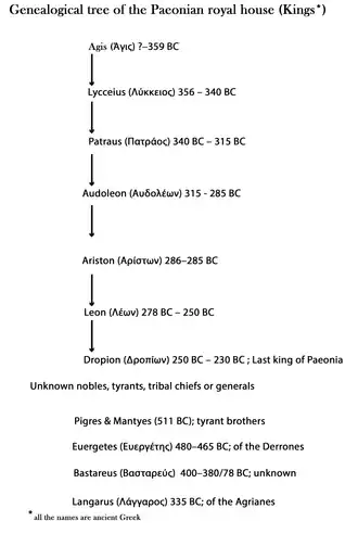 - ↑ The Cambridge Ancient History, Volume 6: The Fourth Century BC by D. M. Lewis, John Boardman, Simon Hornblower, and M. Ostwald, 1994, page 463: «Agis, king of Paeonians».