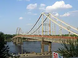 | 5 | Парковый мост | Киев | 50°27′24″ с. ш. 30°32′03″ в. д. | Пешеходный | Подвесной металлический (высота пилонов 32 м), длина 429 м, ширина 7 м, высота над водой 26 м | 3 июля 1957 | |