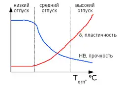 Отпуск проводят с целью получения более высокой пластичности и снижения хрупкости материала при сохранении приемлемого уровня его прочности. Для этого изделие подвергается нагреву в печи до температуры от 150—260 °C до 370—650 °C с последующим медленным остыванием.