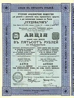Устав Русского акционерного общества «Ссудовагон», созданного с целью кредитования строительства железнодорожного подвижного состава (паровозов и вагонов), а также развития электрифицированных и паровых железнодорожных и трамвайных линий России был Высочайше утвержден 23 октября 1907 г.[2]. В результате изменений Устава, утвержденных 14 февраля 1912 г., основной капитал компании составил 3 млн. рублей, разделенных на три серии в млн. руб. каждая, сформированных в свою очередь из 2 тыс. акций в 500 руб.