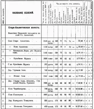 | 11 | Старое Альметьево (Альметева)[15] | деревня, позже село, административный центр | русские и татары | 2 149 |