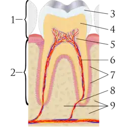 - Пародонтит. Под этим термином понимается патологический процесс, в который вовлечены окружающие зуб ткани: периодонт, костная ткань альвеолы и десна. Это заболевание является вторым по частоте из числа стоматологических и наблюдается более чем у половины людей старше 30 лет. Существует несколько теорий, касающихся его этиологии: в частности, имеются мнения, согласно которым соответствующий процесс вызывается трофическими причинами (то есть нарушением питания тканей) и дисфункцией нервной системы, что, в свою очередь, приводит к атрофии пародонта, или же местными раздражающими факторами вроде зубного камня, или эндокринной недостаточностью, или воздействием тех или иных микроорганизмов наподобие зубной спирохеты. Проявляется пародонтит разнообразно, начинается главным образом с ощущений зуда и жжения десен; по мере его развития десна гиперемирует, отекает, развиваются застойные явления и — как следствие — цианоз десны. Также симптомами могут быть появление запаха из рта и кровоточивости десен. По мере прогрессирования заболевания формируются патологические десневые карманы, в которых может начаться воспалительный процесс, приводящий к постепенному замещению связочного аппарата зуба грануляционной тканью. Зуб становится подвижен и в конце концов может выпасть. Консервативное лечение пародонтита является комплексным: общим (укрепление организма в целом) и местным (нормализация состояния пародонта); может применяться также и хирургическое лечение[7].