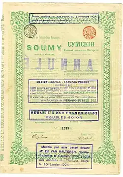 15 ноября (28 ноября по новому стилю) 1896 года Указом императора Николая ІІ были утверждены условия деятельности в России Бельгийского акционерного общества «Сумские машиностроительные мастерские (анонимное общество)».